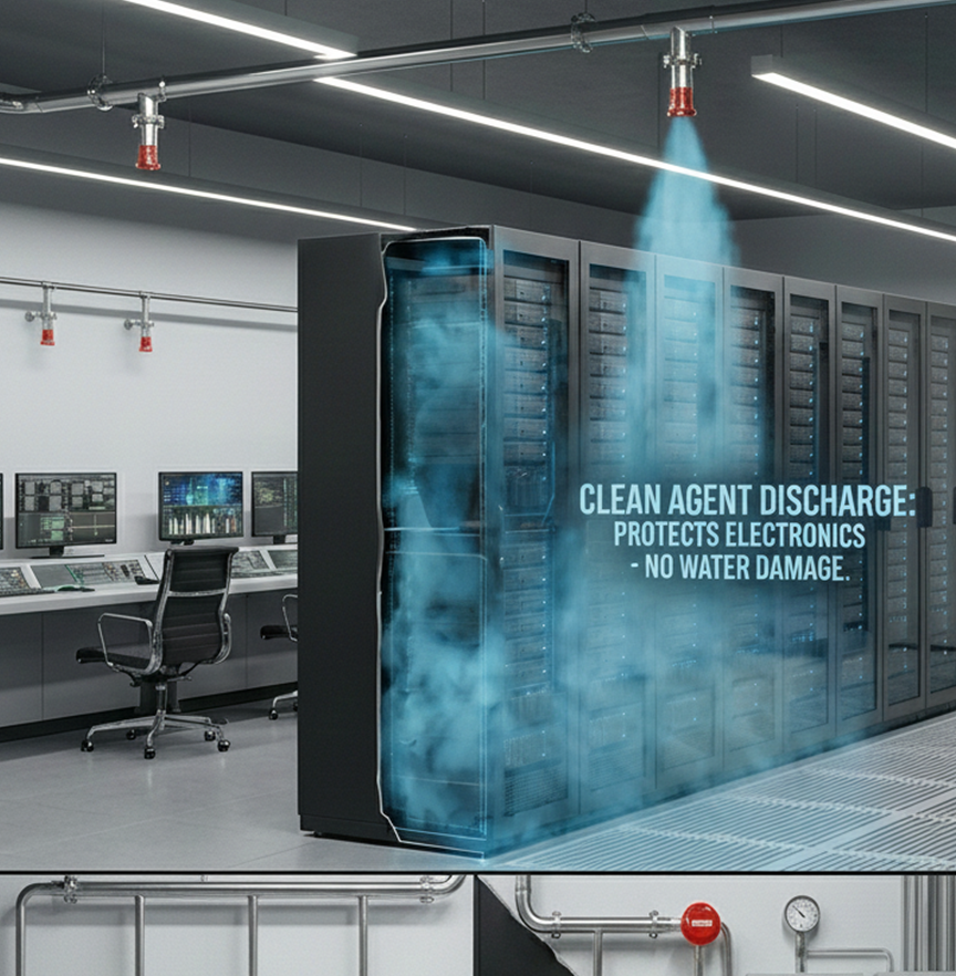Clean agent systems (FM-200, NOVEC 1230, CO2, Inergen) for server rooms, control rooms, and sensitive areas type classification as per IS 2190 and NFPA 10.
